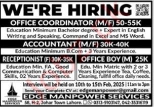 Vacant posts including receptionist, office boy, office coordinator and accountant are announced in Edge Manpower Services Lahore, lahore Punjab Pakistan as per 9 February 2025 advertisement in daily Jang Newspaper. Educational qualifications required B.com, Others, Bachelor, Matric and Intermediate etc.