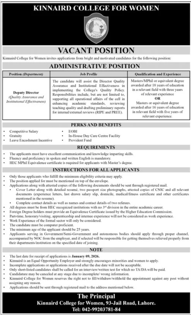 Vacancies in Kinnaird College for Women KCW Advertisement December 2025