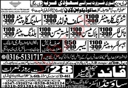 Sound Lines Recruiting Promotion jobs advertisement dated about 18 August 2025 in daily Express Newspaper invites application for the vacant post of Shuttering Carpenter, Gypsum Fixer, Plaster Mason, Ceiling Carpenter, Block Mason, Building Painter, Scaffolder, Labor and Tile Fixer in Jeddah, jeddah Saudi Arabia. Persons with Middle, Intermediate, Primary and Matric etc. education can apply.