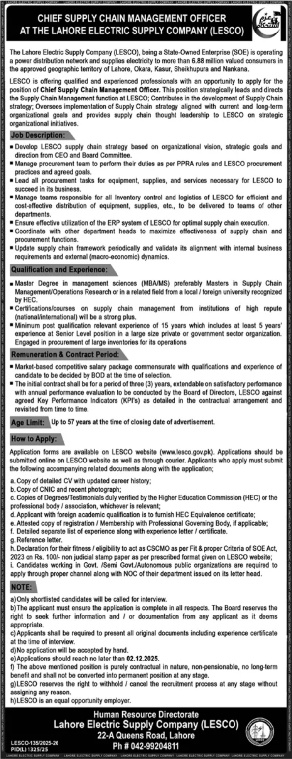 Latest Government jobs in Lahore Electric Supply Company LESCO in Management and others can be applied till 2 December 2025 or as per closing date in newspaper ad. Read complete ad online to know how to apply on latest Lahore Electric Supply Company LESCO job opportunities.