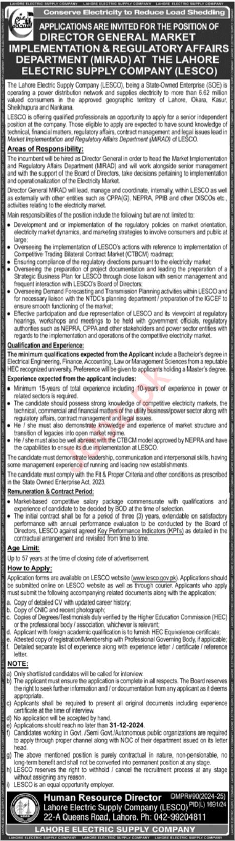 Lahore Electric Supply Company LESCO jobs advertisement dated about 15 December 2024 in daily Jang Newspaper invites application for the vacant post of director general in Lahore, lahore Punjab Pakistan. Bachelor and Master etc. educational qualification will be preferred.