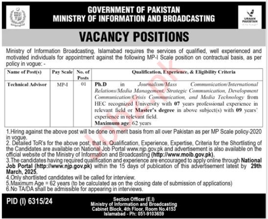 Ministry of Information and Broadcasting is looking for candidates for following posts as per job advertisement published in daily Jang Newspaper of March 16, 2025 for location G-5 Islamabad, islamabad Islamabad Pakistan: