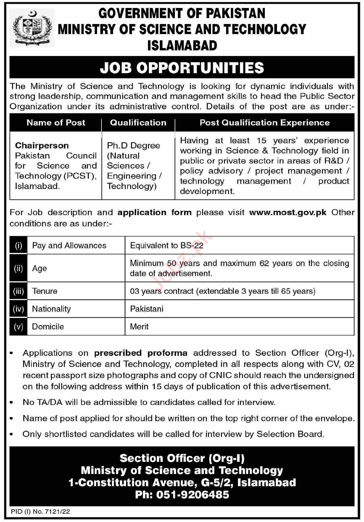 Ministry of Science and Technology MOST is looking for candidates for following posts as per job advertisement published in daily Dawn Newspaper of May 22, 2023 for location Islamabad, islamabad Islamabad Pakistan: