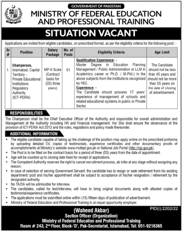 Ministry of Federal Education & Professional Training MOENT is looking for candidates for following posts as per job advertisement published in daily Jang Newspaper of October 8, 2022 for location Islamabad, islamabad Islamabad Pakistan: