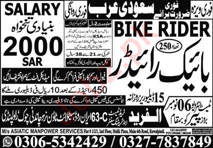 MS Asiatic Manpower Serices Riyadh, riyadh Saudi Arabia invites applications from eligible candidates for the post of bike rider as per advertisement of November 6, 2023 published in daily Express Newspaper. Persons with Middle and Matric etc. education can apply.