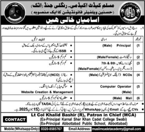 Vacancies in Muslim Cadet Academy MCA Advertisement May 2025