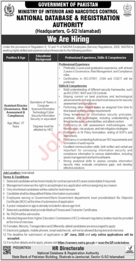 National Database & Registration Authority NADRA is looking for candidates for following posts as per job advertisement published in daily Jang Newspaper of June 15, 2025 for location G-5 Islamabad, islamabad Islamabad Pakistan: