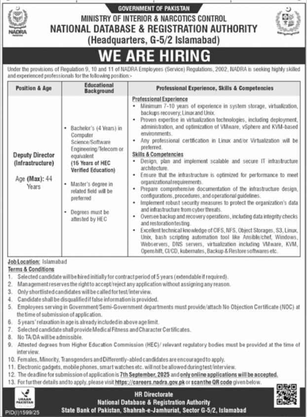 National Database & Registration Authority NADRA is looking for candidates for following posts as per job advertisement published in daily Jang Newspaper of August 25, 2025 for location Islamabad, islamabad Islamabad Pakistan: