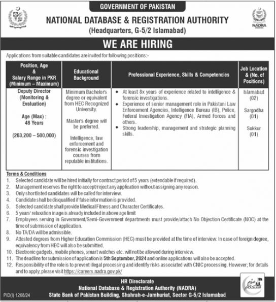 National Database & Registration Authority NADRA invites applications for job positions advertised in daily Jang dated 22 August 2024 for following vacancies in Islamabad, islamabad Islamabad Pakistan.