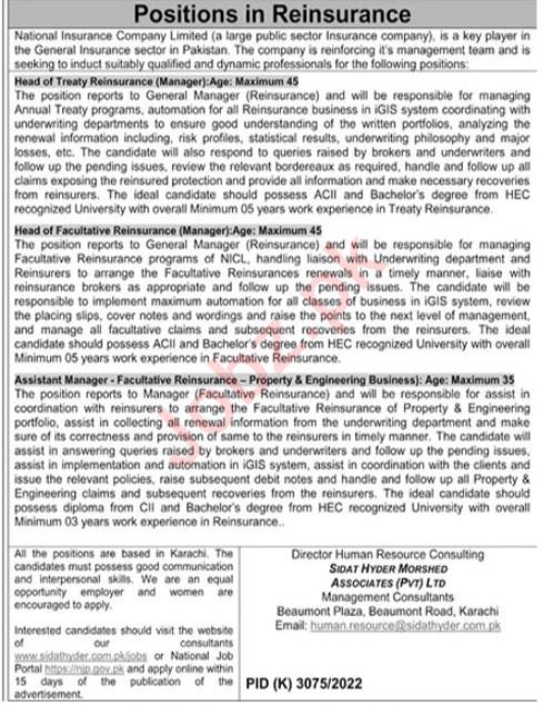 National Insurance Company Limited NICL jobs advertisement dated about 1 May 2023 in daily The News Newspaper invites application for the vacant post of assistant manager, manager head of treaty reinsurance and manager head of facultative reinsurance in Lahore, lahore Punjab Pakistan. Preferred Education is MBA, BBA, MS, Bachelor and Master etc.