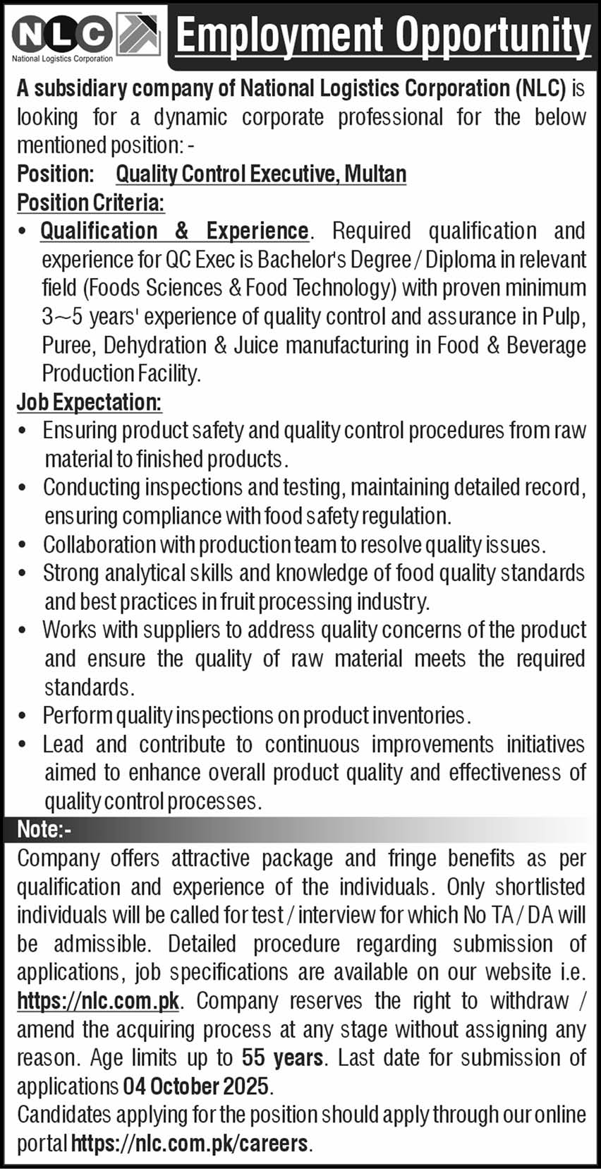 National Logistics Corporation NLC is looking for candidates for following posts as per job advertisement published in daily Other Newspaper of September 19, 2025 for location Multan, multan Punjab Pakistan: