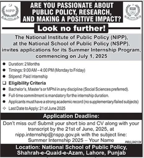 Vacant posts including internship program are announced in National School of Public Policy NSPP Kabirwala, lahore Punjab Pakistan as per 20 June 2025 advertisement in daily The News Newspaper. Educational qualifications required Master, MS, Bachelor and Mphil etc.