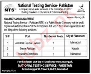 National Testing Service NTS H-8 Islamabad, islamabad Islamabad Pakistan invites applications from eligible candidates for the post of assistant operator, asistant director content and sr assistant as per advertisement of August 17, 2025 published in daily Jang Newspaper. Preferred Education is Master and Bachelor etc.