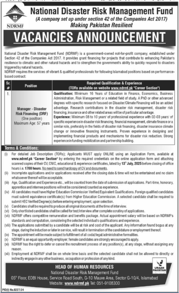 National Disaster Risk Management Fund NDRMF jobs advertisement dated about 29 May 2025 in daily Ausaf Newspaper invites application for the vacant post of manager disaster risk financing in Islamabad, islamabad Islamabad Pakistan. Candidates with Bachelor, MS and Master etc. educational background will be preferred.
