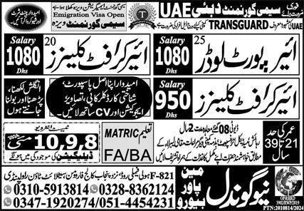 New Gondal Manpower Bureau jobs advertisement dated about 7 May 2024 in daily Express Newspaper invites application for the vacant post of aircraft cleaner and airport loader in Dubai, dubai Dubai. Preferred Education is Matric, Middle and Primary etc.