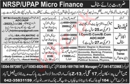 NRSP Microfinance Bank Limited Faisalabad, faisalabad Punjab Pakistan invites applications from eligible candidates for the post of account staff, management trainee and field staff as per advertisement of July 10, 2023 published in daily Dunya Newspaper. Candidates with Intermediate, Master, MS, Matric and Bachelor etc. educational background will be preferred.