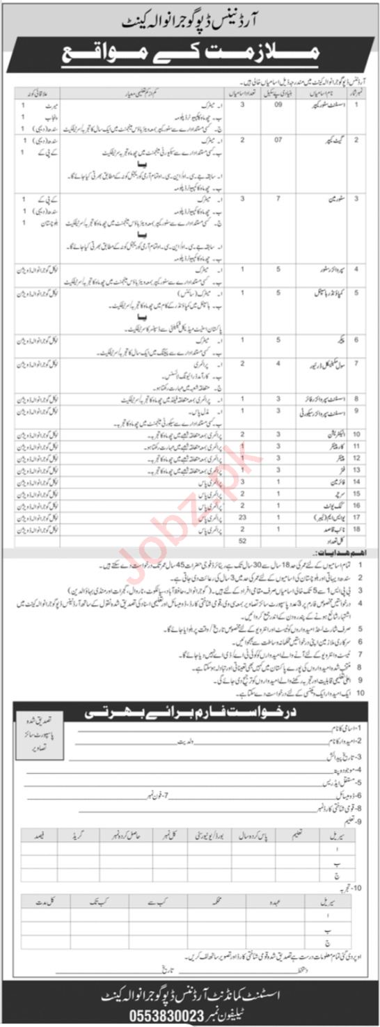 Vacant posts including Supervisor Store, Packer, Fireman, Painter, Searcher, Assistant Supervisor Security, Cook Unit, Store Man, Fitter, Electrician, Gate Keeper, Naib Qasid, Assistant Store Keeper, Assistant Supervisor Fire, Carpenter and Civil Mechanical Driver are announced in Ordnance Depot Gujranwala, gujranwala Punjab Pakistan as per 5 May 2024 advertisement in daily Jang Newspaper. Educational qualifications required Middle, Matric and Primary etc.