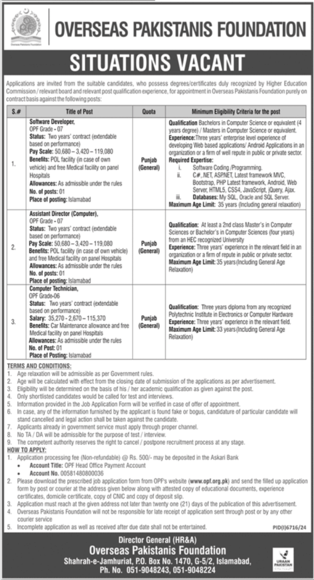 Overseas Pakistanis Foundation OPF jobs advertisement dated about 30 March 2025 in daily Jang Newspaper invites application for the vacant post of computer technician, assistant director and software developer in G-5 Islamabad, islamabad Islamabad Pakistan. Persons with Master, Bachelor, Intermediate and MS etc. education can apply.