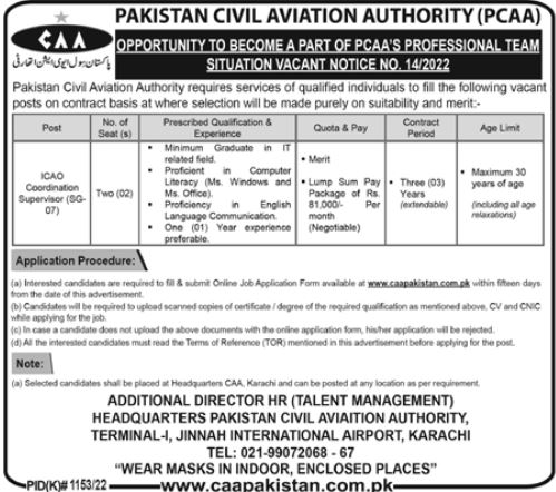 Vacant posts including coordination supervisor are announced in Pakistan Civil Aviation Authority CAA Karachi, karachi Sindh Pakistan as per 29 October 2022 advertisement in daily Aaj Newspaper. Candidates with Bachelor and Master etc. educational background will be preferred.