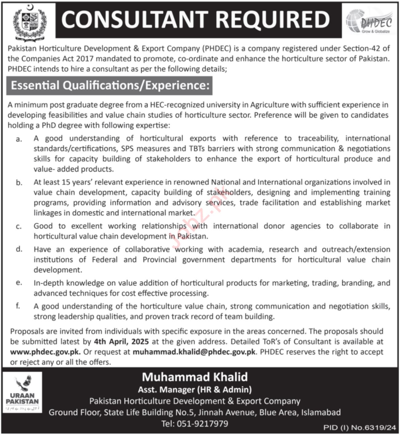 Latest Government jobs in Pakistan Horticulture Development & Export Company in Consultant and others can be applied till 4 April 2025 or as per closing date in newspaper ad. Read complete ad online to know how to apply on latest Pakistan Horticulture Development & Export Company job opportunities.