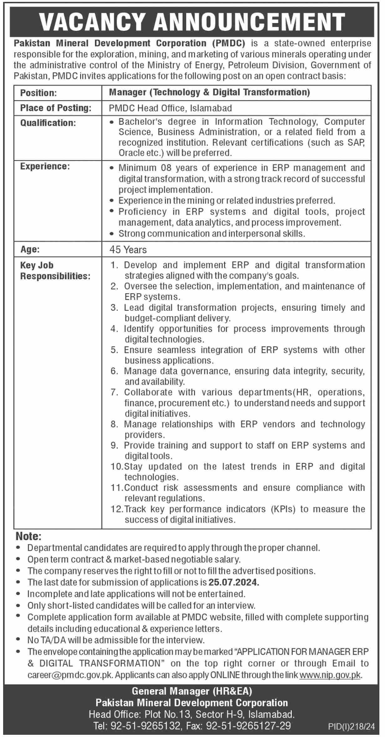 Vacant posts including manager are announced in Pakistan Mineral Development Corporation Islamabad, islamabad Islamabad Pakistan as per 11 July 2024 advertisement in daily Dawn Newspaper. Educational qualifications required MS, Master and Bachelor etc.