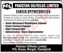 Pakistan Oilfields Limited POL invites applications for job positions advertised in daily Jang dated 25 June 2023 for following vacancies in Rawalpindi, rawalpindi Punjab Pakistan.