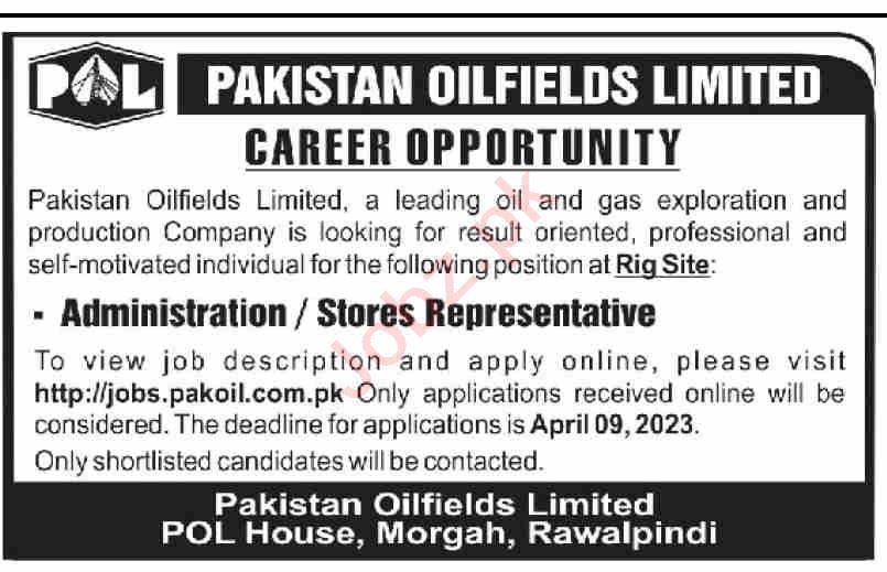 Pakistan Oilfields Limited POL Rawalpindi, rawalpindi Punjab Pakistan invites applications from eligible candidates for the post of store representative and administration as per advertisement of April 3, 2023 published in daily Dawn Newspaper. Candidates with Bachelor, Master and MS etc. educational background will be preferred.