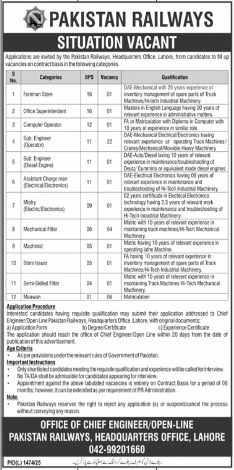 Vacant posts including Semi Skilled Fitter, Sub Engineer, Computer Operator, Sub Engineer Diesel Engine, Assistant Charge Man, Muawan, Store Issuer, Office Superintendent, Mistry, Assistant Charge Man Electrical, Machinist, Foreman Store, Assistant Charge Man Electronics, Sub Engineer Operator and Mechanical Fitter are announced in Pakistan Railways Lahore, lahore Punjab Pakistan as per 3 December 2025 advertisement in daily Jang Newspaper. Preferred Education is Intermediate, Middle, Matric and Bachelor etc.