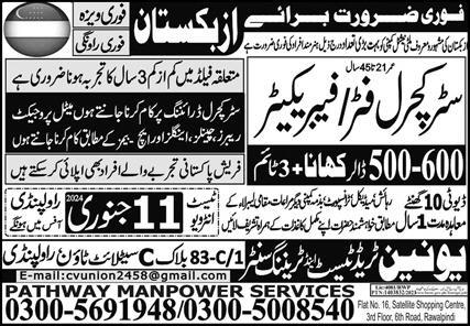 Pathway Manpower Services Tashkent, tashkent Uzbekistan invites applications from eligible candidates for the post of fabricator and structure fitter as per advertisement of January 10, 2024 published in daily Express Newspaper. Middle, Matric and Primary etc. educational qualification will be preferred.