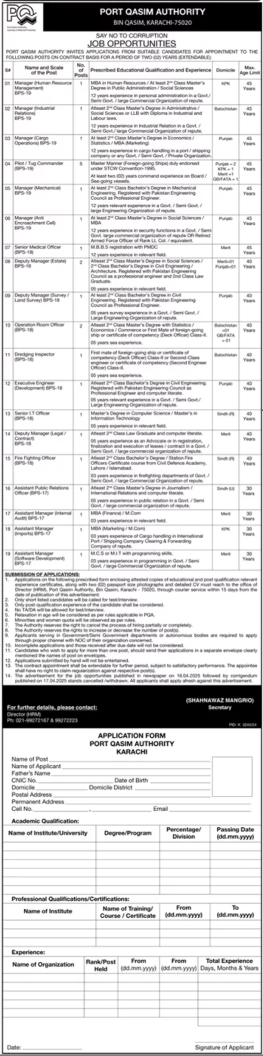 Vacant posts including Pilot, Deputy Manager Contract, Dredging Inspector, Manager Human Resource Management, Executive Engineer, Assistant Public Relations Officer, Deputy Manager Estate, Deputy Manager Legal, Fire Fighting Officer, Assistant Manager Internal Audit, Deputy Manager Survey, Manager, It Officer, Medical Officer, Operation Room Officer, Executive Engineer Development, Manager Cargo Operations, Manager Anti Enforcement Cell, Manager Mechanical, Deputy Manager Land Survey, Tug Commander, Deputy Manager, Assistant Manager Software Development, Assistant Manager Imports, Assistant Manager and Manager Industrial Relations are announced in Port Qasim Authority PQA Karachi, karachi Sindh Pakistan as per 25 April 2025 advertisement in daily Dunya Newspaper. MS, Bachelor and Master etc. educational qualification will be preferred.