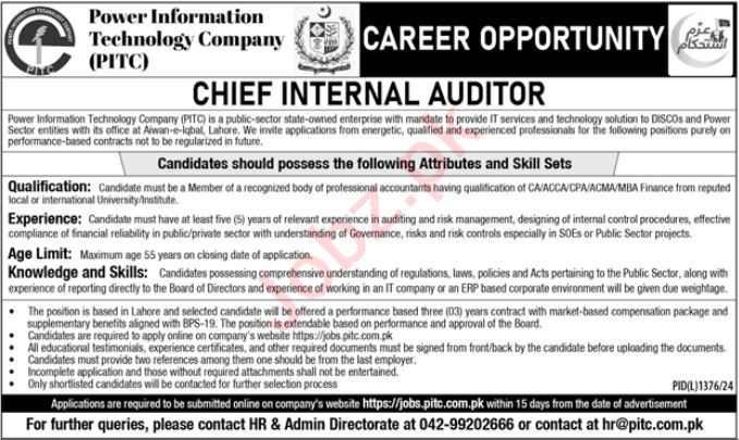 Power Information Technology Company PITC jobs advertisement dated about 17 November 2024 in daily Jang Newspaper invites application for the vacant post of chief internal auditor in Lahore, lahore Punjab Pakistan. Educational qualifications required CA, Master, ACCA, MBA and Others etc.