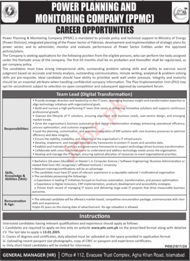 Power Planning and Monitoring Company jobs advertisement dated about 30 December 2024 in daily Jang Newspaper invites application for the vacant post of team lead digital transformation in Islamabad, islamabad Islamabad Pakistan. Candidates with Bachelor etc. educational background will be preferred.
