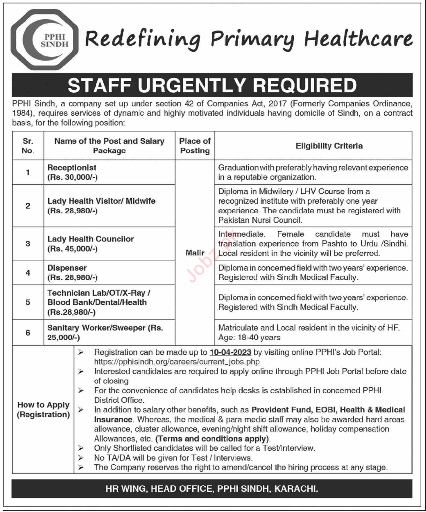 PPHI Sindh Karachi, karachi Sindh Pakistan invites applications from eligible candidates for the post of sanitary worker, lady health councilor, receptionist, dispenser, technician lab and lady health visitor as per advertisement of April 3, 2023 published in daily Dawn Newspaper. Candidates with Matric, Bachelor and Intermediate etc. educational background will be preferred.