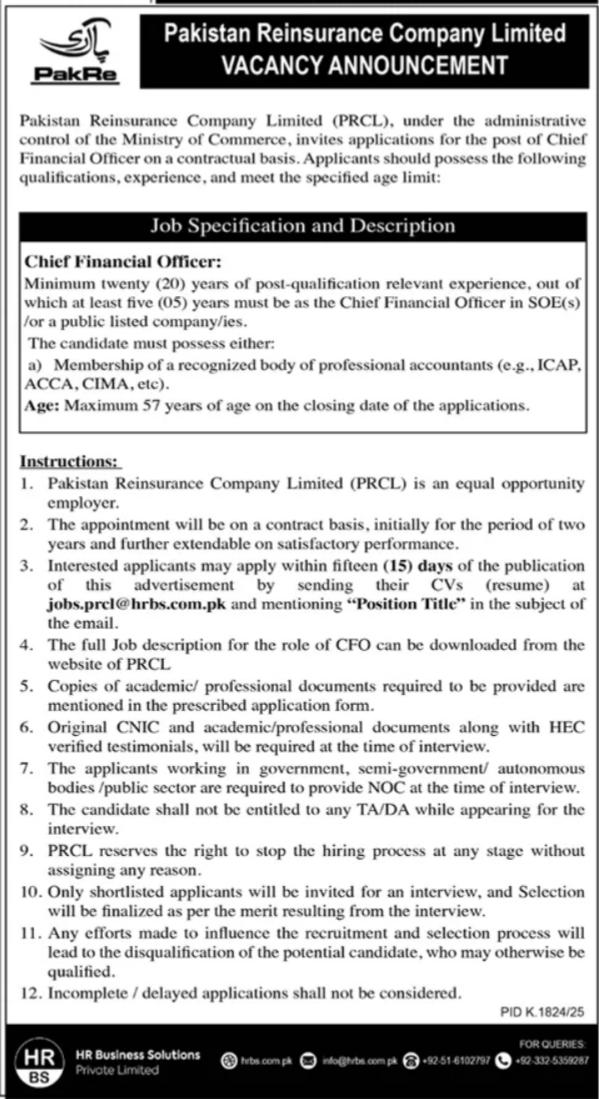 Pakistan Reinsurance Company Limited PRCL jobs advertisement dated about 24 November 2025 in daily Dunya Newspaper invites application for the vacant post of chief financial officer in Islamabad, islamabad Islamabad Pakistan. Educational qualifications required Bachelor, MS and Master etc.