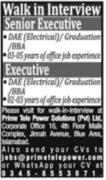 Prime Tele Power Solutions Ltd Islamabad, islamabad Islamabad Pakistan invites applications from eligible candidates for the post of executive and sr executive as per advertisement of January 26, 2025 published in daily Jang Newspaper. Master, BBA, DAE and Bachelor etc. educational qualification will be preferred.