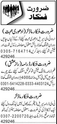 Production House Lahore, lahore Punjab Pakistan invites applications from eligible candidates for the post of model and actor as per advertisement of April 30, 2024 published in daily Roznama 92 News Newspaper. Candidates with Middle, Bachelor, Matric and Intermediate etc. educational background will be preferred.