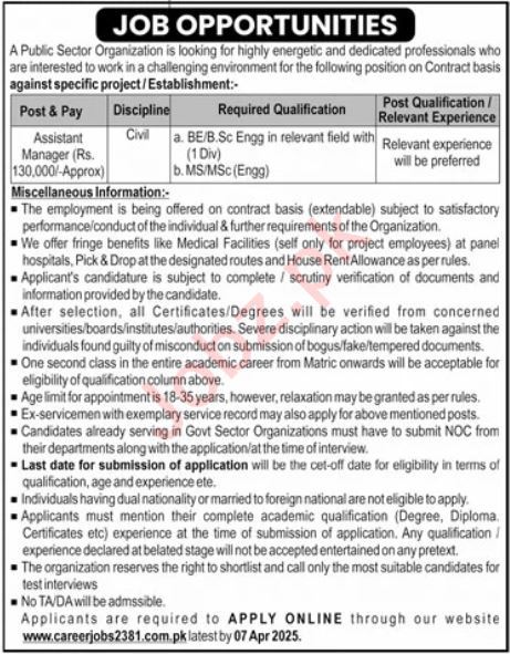 Vacant posts including assistant manager are announced in Progressive Public Sector Organization Lahore, lahore Punjab Pakistan as per 23 March 2025 advertisement in daily Jang Newspaper. Candidates with Bachelor and B.E etc. educational background will be preferred.