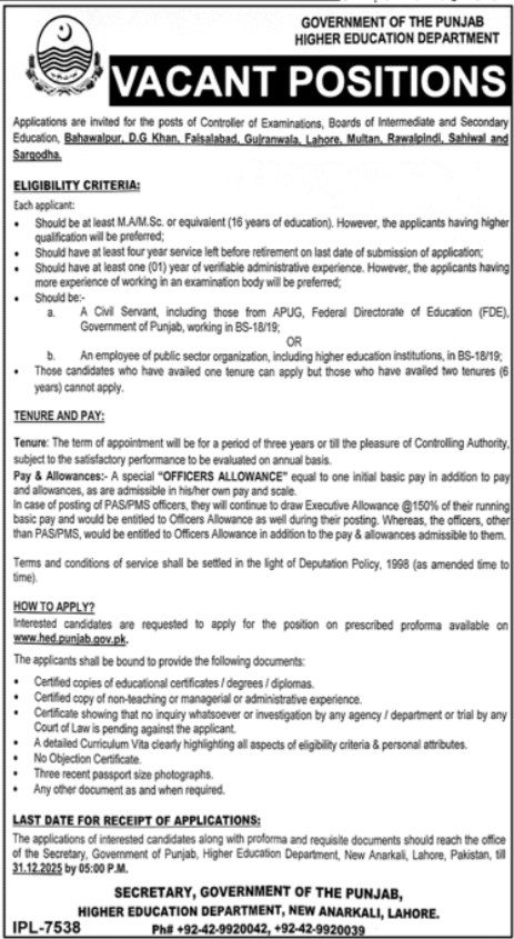 Vacant posts including controller of examinations are announced in Punjab Higher Education Department Anarkali Lahore, lahore Punjab Pakistan as per 16 December 2025 advertisement in daily Jang Newspaper. Candidates with M.sc, MA and Master etc. educational background will be preferred.
