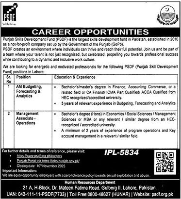 Punjab Skills Development Fund PSDF jobs advertisement dated about 4 November 2025 in daily The News Newspaper invites application for the vacant post of management associate operation and am budgeting forecasting analytics in Lahore, lahore Punjab Pakistan. Master, Bachelor and MS etc. educational qualification will be preferred.