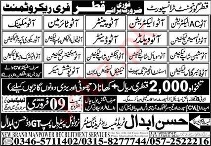 Vacant posts including Auto Injection Shop Technician, Auto Fuel Injection Pump Technician, Auto Welder, Auto Electric Vehicle Technician, Auto Electrician, Auto Posish Maker, Auto Machine Shop Technician, Auto Denter, Auto Painter, Auto Transmission Technician, Auto Fiberglass Technician, Auto Ac Electrician, Assistant Engineering Support, Auto Recovery Operator Technician, Automobile Shop Technician, Auto Tyreman, Auto Maintenance Technician, Auto Mechanic and Technical Inspection Agent are announced in Hassan Abdal Trade Test & Training Center Qatar, qatar Qatar as per 9 February 2025 advertisement in daily Express Newspaper. Candidates with Middle, Matric, Intermediate and Primary etc. educational background will be preferred.