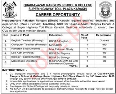 Vacant posts including Computer Teacher, Montessori Directress, Pakistan Study Teacher, English Teacher and Biology Teacher are announced in Quaid e Azam Rangers School & College Karachi, karachi Sindh Pakistan as per 29 October 2023 advertisement in daily The News Newspaper. Educational qualifications required MS, Bachelor, Master, M.sc, MA and BA etc.