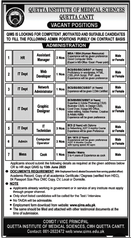 Quetta Institute of Medical Sciences QIMS Quetta, quetta Balochistan Pakistan invites applications from eligible candidates for the post of cook, it technician, computer operator, web developer, network adminstrator, assistant manager and graphic designer as per advertisement of May 27, 2025 published in daily Nawaiwaqt Newspaper. Persons with Middle, Master, MS, Bachelor, Intermediate and Matric etc. education can apply.