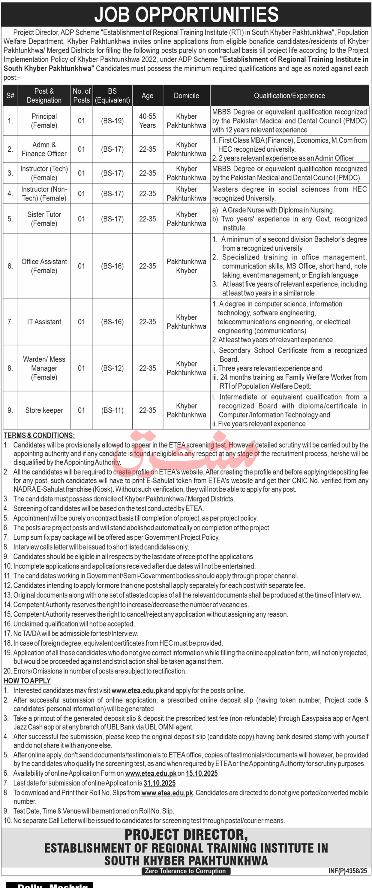 Regional Training Institute Peshawar, peshawar Khyber Pakhtunkhwa KPK Pakistan invites applications from eligible candidates for the post of admin finance officer, sister tutor, store keeper, principal, warden, it assistant, instructor, mess manager and office assistant as per advertisement of October 14, 2025 published in daily Mashriq Newspaper. Preferred Education is Bachelor, Master and MS etc.