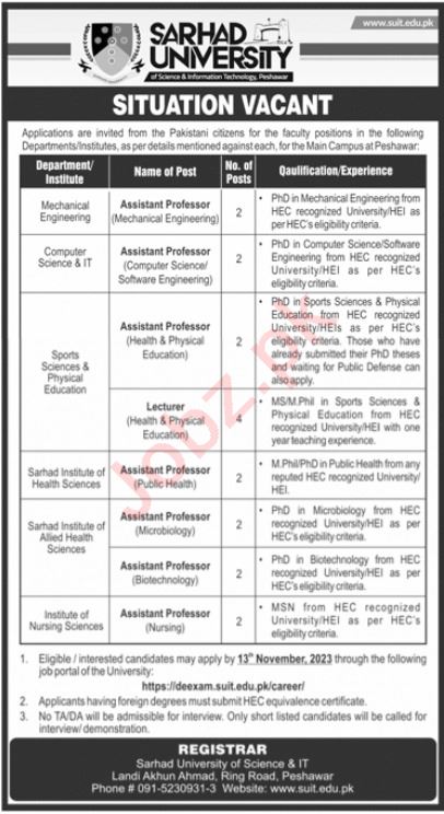 Sarhad University of Science & Information Technology Peshawar, peshawar Khyber Pakhtunkhwa KPK Pakistan invites applications from eligible candidates for the post of assistant professor, lecturer health physical education, assistant professor biotechnology, assistant professor public health, assistant professor computer science, assistant professor microbiology, assistant professor nursing, assistant professor mechanical engineering and assistant professor health physical education as per advertisement of November 5, 2023 published in daily Jang Newspaper. Educational qualifications required Bachelor, Phd, Mphil and Master etc.