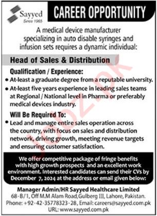Sayyed Health Care Lahore, lahore Punjab Pakistan invites applications from eligible candidates for the post of head of sales distribution as per advertisement of December 1, 2024 published in daily Jang Newspaper. Educational qualifications required Others, Bachelor and Master etc.
