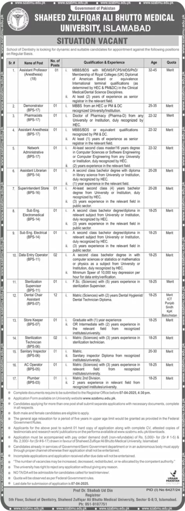 Shaheed Zulfiqar Ali Bhutto Medical University SZABMU jobs advertisement dated about 21 March 2025 in daily Dunya Newspaper invites application for the vacant post of Sub Engineer Electrical, Sterilization Supervisor, Sanitary Inspector, Ac Operator, Demonstrator, Sub Engineer Electromedical, Network Administrative, Sub Engineer, Superintendent Store, Store Keeper, Plumber, Assistant Librarian, Sterilization Technician, Assistant Professor, Assistant Anesthesia, Data Entry Operator, Pharmacist and Dental Chair Assistant in G-8 Islamabad, islamabad Islamabad Pakistan. Preferred Education is Mphil, Matric, Master, Bachelor, Middle and Phd etc.