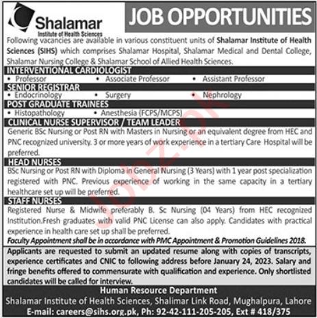 Shalamar Institute of Health Sciences Lahore, lahore Punjab Pakistan invites applications from eligible candidates for the post of registrar endocrinology, post graduate trainee histopathology, assistant professor interventional cardiologist, fcps trainee anesthesia, mcps trainee anesthesia, professor interventional cardiologist, registrar surgery, professor, registrar nephrology, registrar, post graduate trainee, associate professor interventional cardiologist, staff nurse, team leader, post graduate trainee anesthesia, head nurse and clinical nurse supervisor as per advertisement of January 15, 2023 published in daily Jang Newspaper. Preferred Education is Master, MBBS and Bachelor etc.