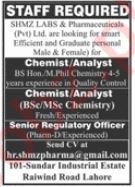 SHMZ Labs & Pharmaceuticals Pvt Ltd Lahore, lahore Punjab Pakistan invites applications from eligible candidates for the post of analyst, chemist and sr regulatory officer as per advertisement of November 17, 2024 published in daily Jang Newspaper. Persons with Bachelor, Mphil, Others, M.sc and Master etc. education can apply.