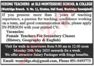 SLS Montessori School and College is looking for candidates for following posts as per job advertisement published in daily Jang Newspaper of May 26, 2025 for location Westridge Rawalpindi, rawalpindi Punjab Pakistan: