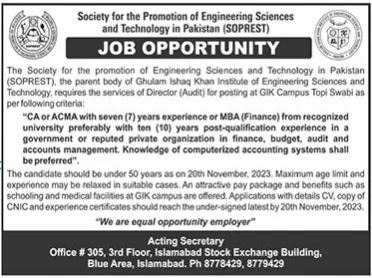 Society for the Promotion of Engineering Sciences & Technology SOPREST is looking for candidates for following posts as per job advertisement published in daily The News Newspaper of November 4, 2023 for location Islamabad, islamabad Islamabad Pakistan: